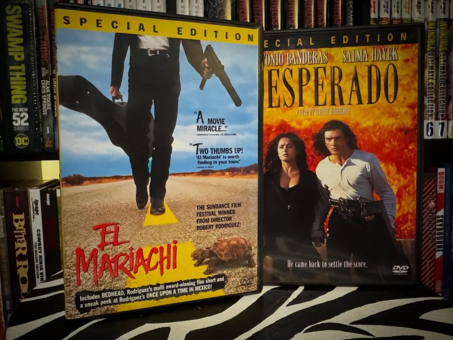 Rodriguez’s 1995 book, Rebel Without A Crew, became an unofficial film school textbook, wherein he would recount stories of ingenuity and necessity, from editing techniques to mimic rapid gunfire to submitting himself into clinical trials so he’d have paid time to write a screenplay, all to get El Mariachi made. It’s a quick and straightforward read about lo-fi filmmaking and I ate it up. In that same year, he released his biggest movie to date—the bigger-budget sequel of his first film, DESPERADO.
